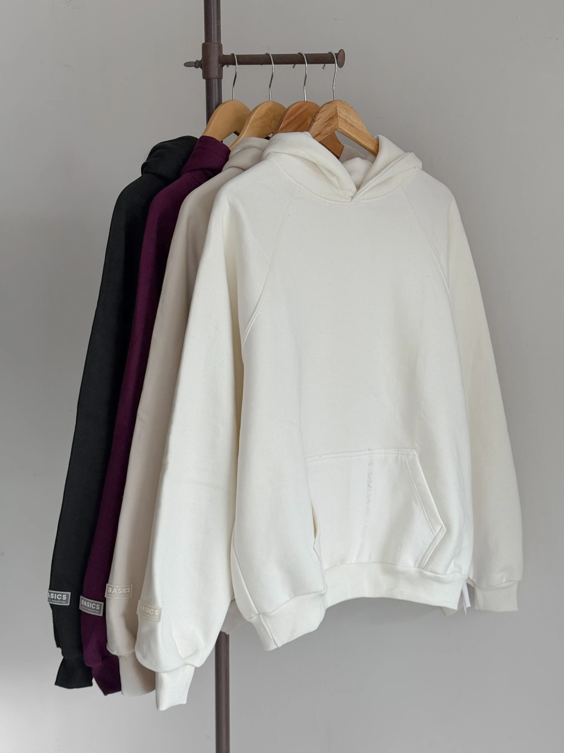 Buzo manga ranglan con un corte intermedio entre un boxy fit y un oversize. Detalle en la manga. Algodón con friza