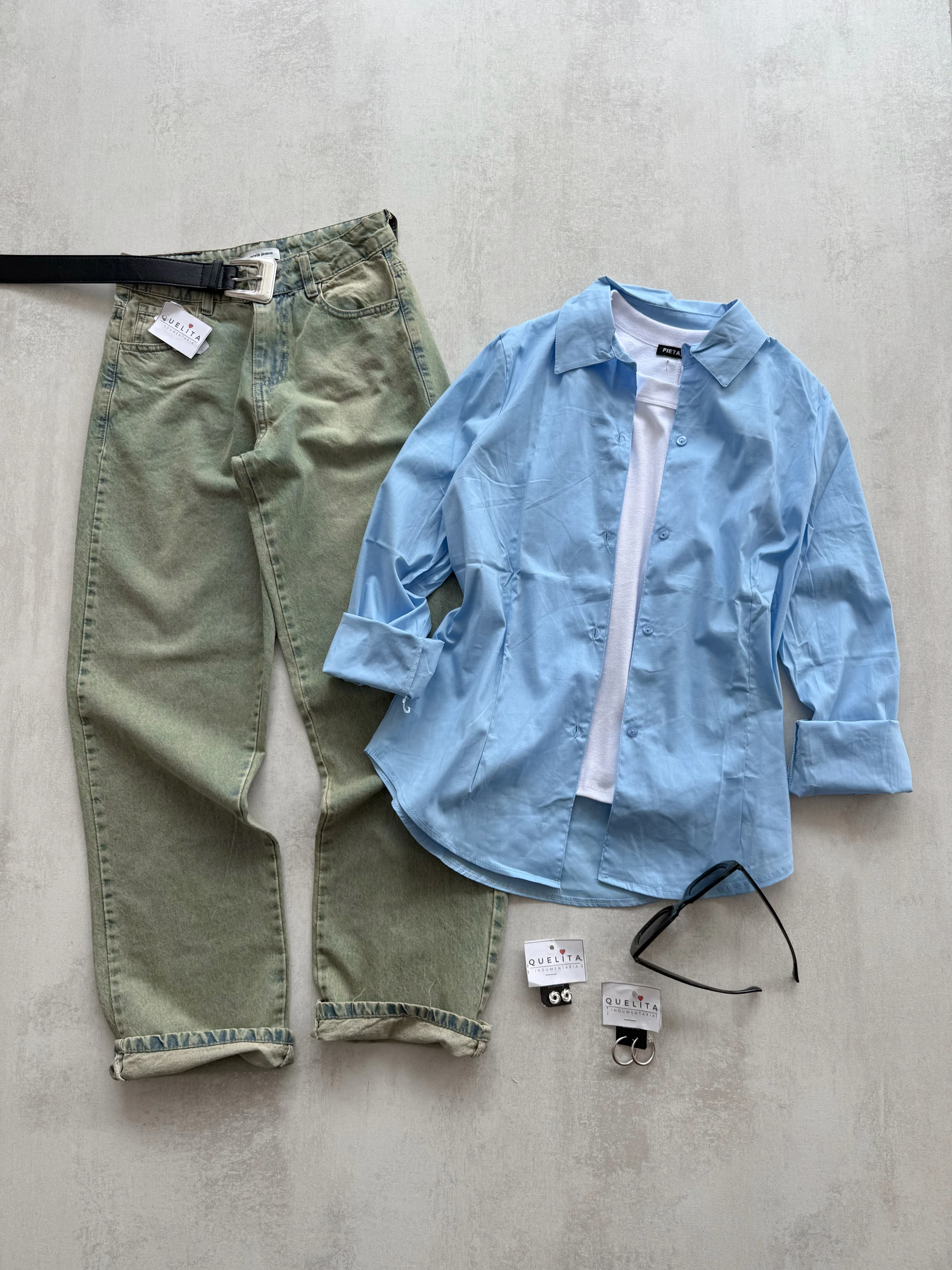 CAMISA CLASICA MANGA LARGA, CON Y SIN ENTALLE EN LA CINTURA, TERMINACION EN U. TALLE UNICO, PERO ABARCA HASTA UN TALLE M.