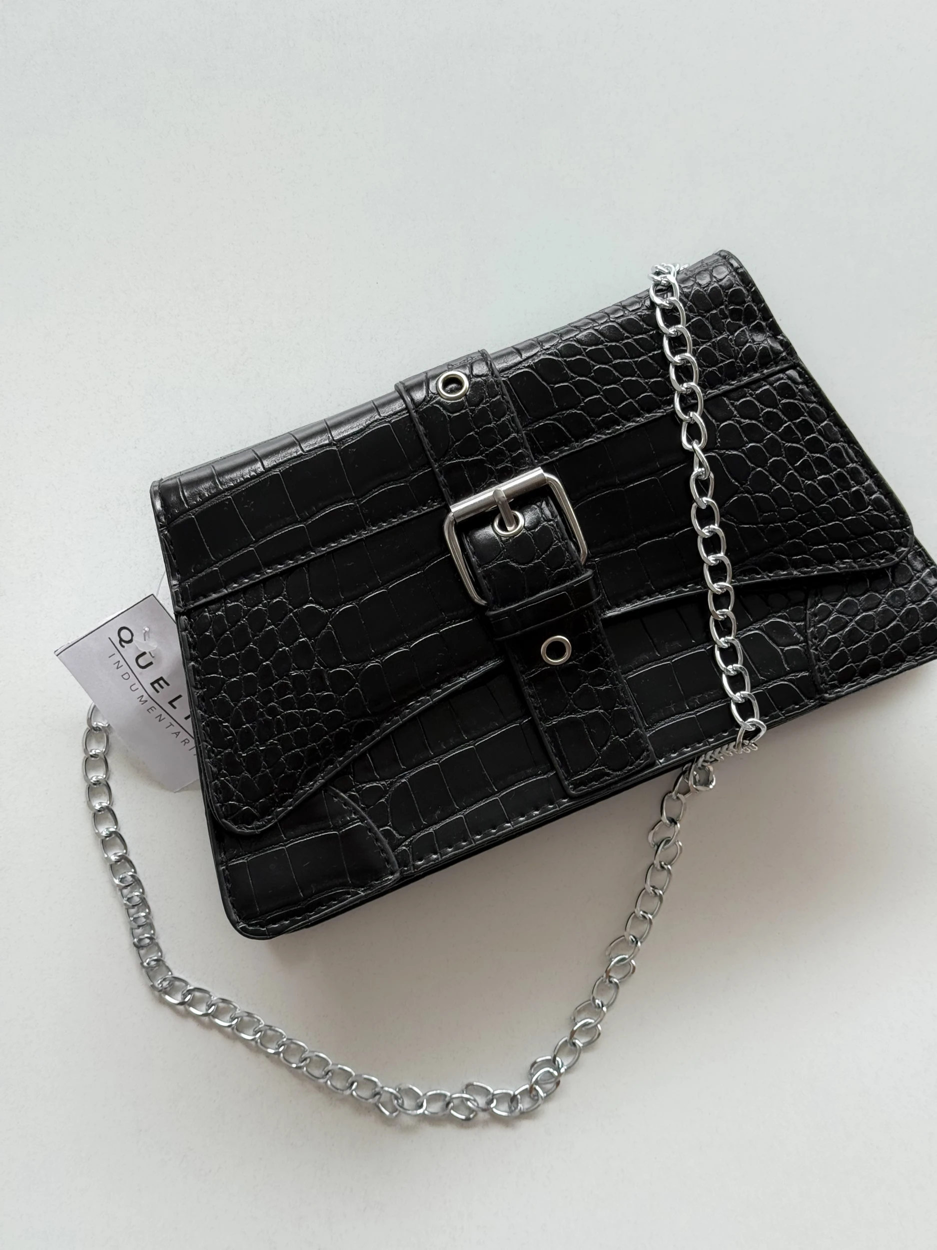 MINI BAG DE ECO CUERO, TEXTURA EN SIMIL CROCO, HEBILLA DE ACCESORIO, FORRADA POR DENTRO, CORREA DE CADENA, VIENE CON CORREA NEGRA DESMONTABLE