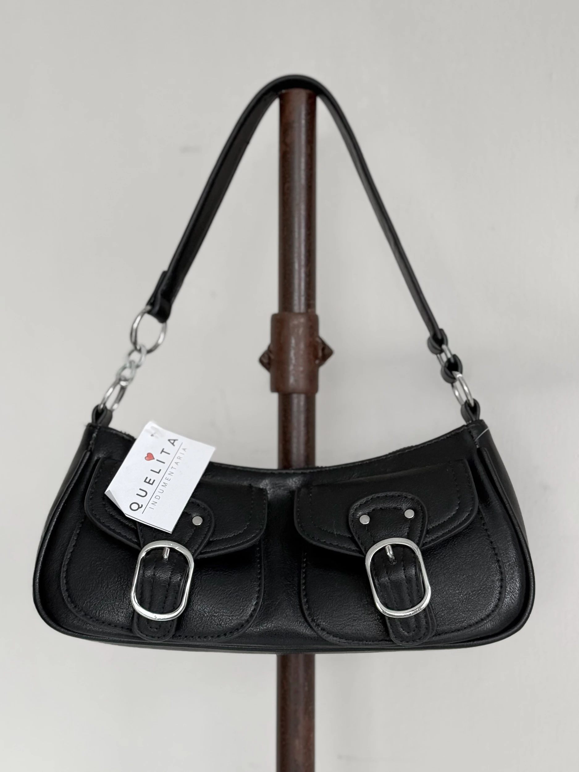 MINI BAG DE ECOCUERO, CON HEBILLAS Y BOLSILLOS DE ACCESORIO, 2 CORREAS DESMONTABLES, UNA CORTA Y OTRA LARGA