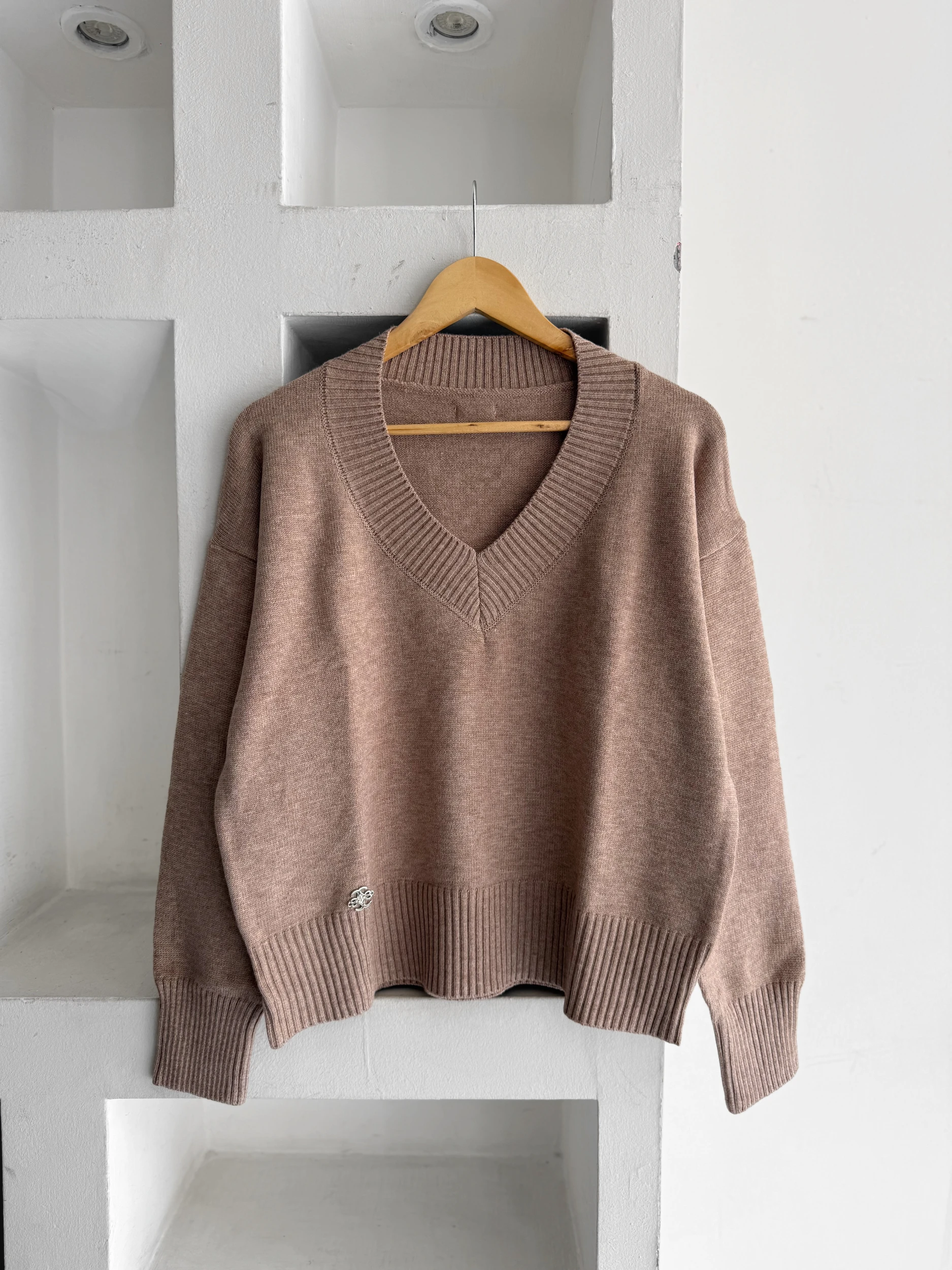 SWEATER TEJIDO DE LANILLA, CUELLO V, CON DETALLE DE ETIQUETA EN EL DORSO