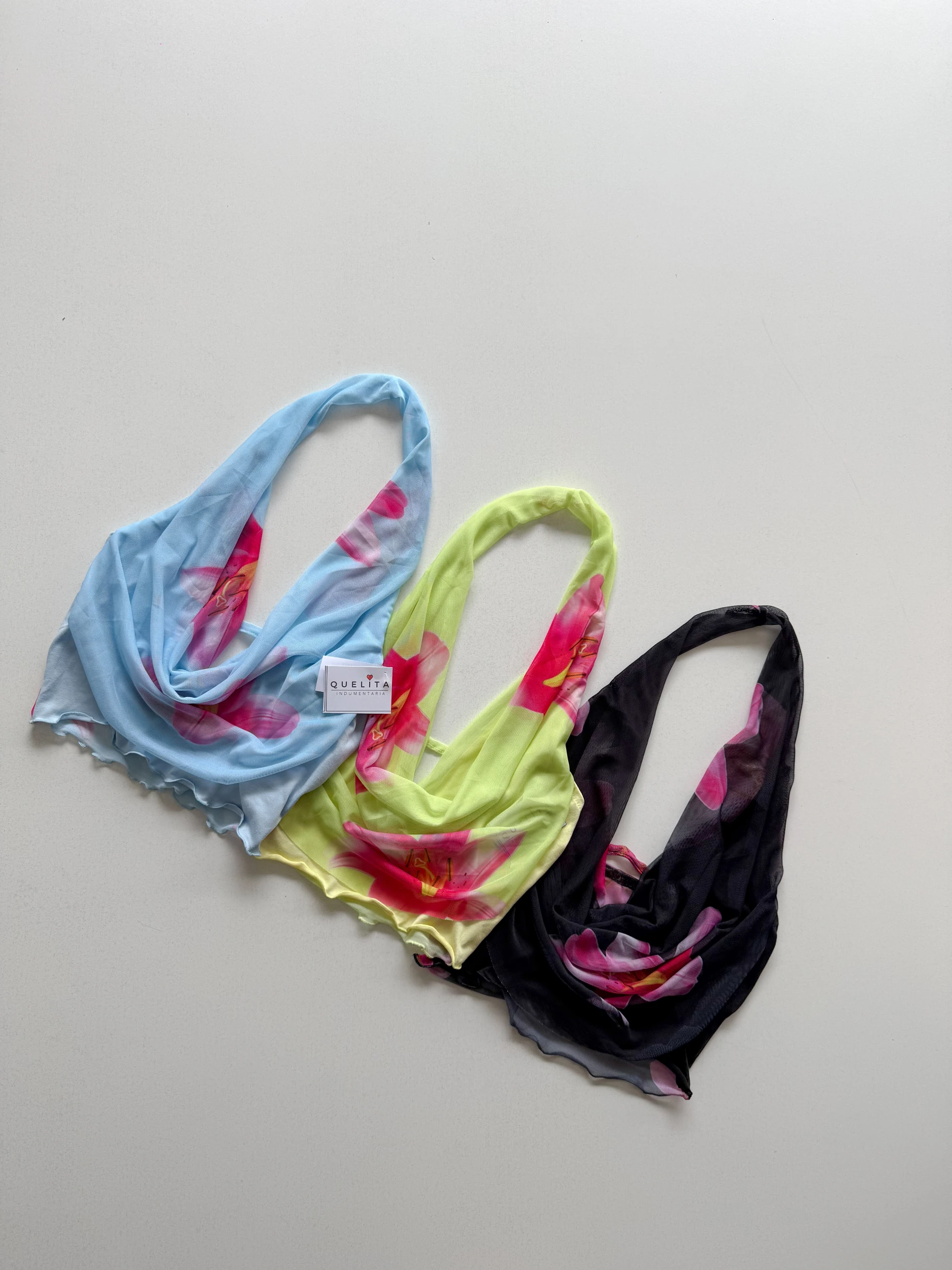 TOP DE MICROTUL, FORRADO POR DENTRO, ESTAMPADO CON FLORES, ESCOTE EN BUCHE, TALLE UNICO QUE ABARCA HASTA UN L